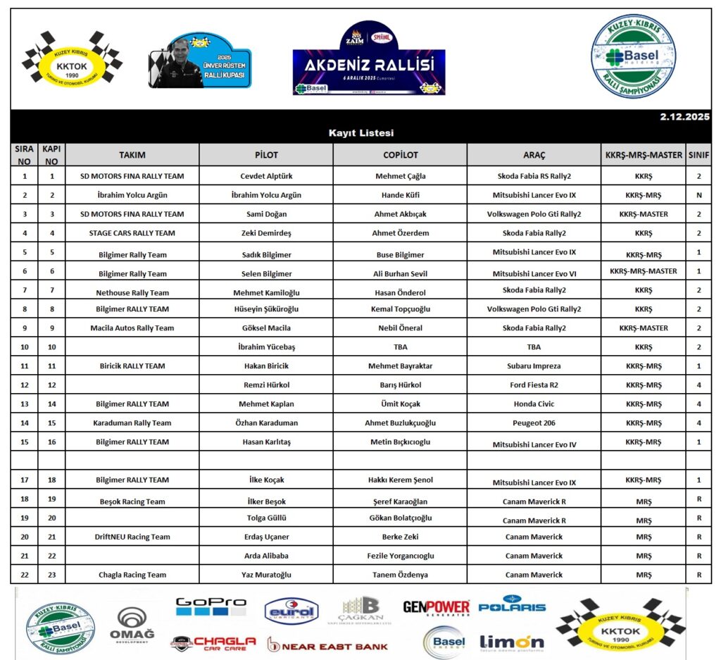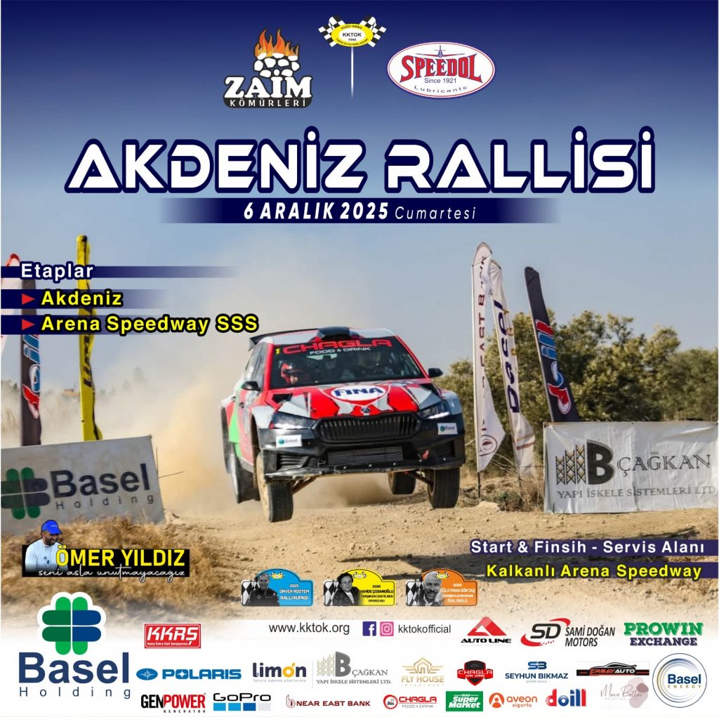 Kuzey Kıbrıs Turing ve Otomobil Kurumu’nun organize ettiği ve ana sponsorluğunu Basel Holding’in üstlendiği 2025 Kuzey Kıbrıs Ralli Şampiyonası’nın 9’uncu ve final yarışı, Akdeniz Rallisi, 6 Aralık 2025 Cumartesi günü, Akdeniz ve Kalkanlı bölgesinde yapılıyor.