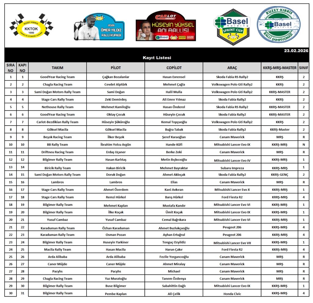 Kuzey Kıbrıs Turing ve Otomobil Kurumu (KKTOK) 2026 sezonuna başlıyor. Basel Holding’in ana sponsorluğunda bu sezon da Ralli, Sprint ve Tırmanma olmak üzere 3 şampiyona gerçekleştirecek olan kurum, sezonu Carlot Auto sponsorluğunda, Hüseyin Yüksel Anı Rallisi ile açıyor. Basel Holding’in şampiyona sponsorluğu ve Carlot Auto’nun yarış sponsorluğunun yanı sıra yarış; Polaris, Genpower, GoPro, Limon, Near East Bank, Çağkan Yapı İskele Sistemleri, Chagla Food&Drink, İkas Supermarket, Chagla Car Care, doill, Aveon Sigorta, Seyhun Bıkmaz Şoför Okulu ve Basel Energy’nin de katkıları ile gerçekleştirilecek.
