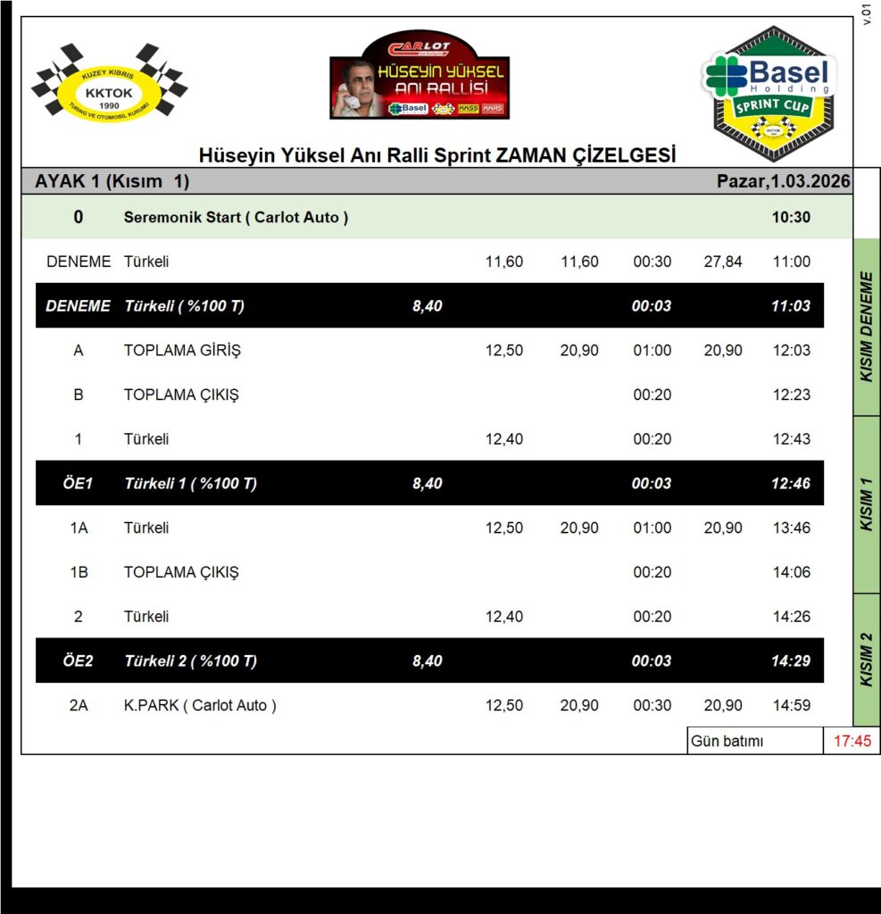 2026 Basel Holding Kuzey Kıbrıs Ralli ve Sprint Şampiyonası ilk yarışı, Lefkoşa Metehan bölgesinde bulunan Carlot Auto önünden pazar sabahı 10.30’da start alacak. 11.00’den itibaren Akdağ olarak da bilinen Türkeli bölgesinde hazırlanan etapta ekipler biri deneme olmak üzere üçer kez start alacaklar. Etap, Zet Karting tesislerinin kuzeyinde başlayıp Akdağ olarak bilinen tepelik bölgenin etrafında geçilecek. 2 seyirci noktasının hazırlanacağı etap Türkeli atış poligonundan takip edilebilinecek. 11.00-15.00 arası devam edecek olan ralli, takribi 15.30’da yine Carlot Auto önünde yapılacak ödül töreni ile tamamlanacak.