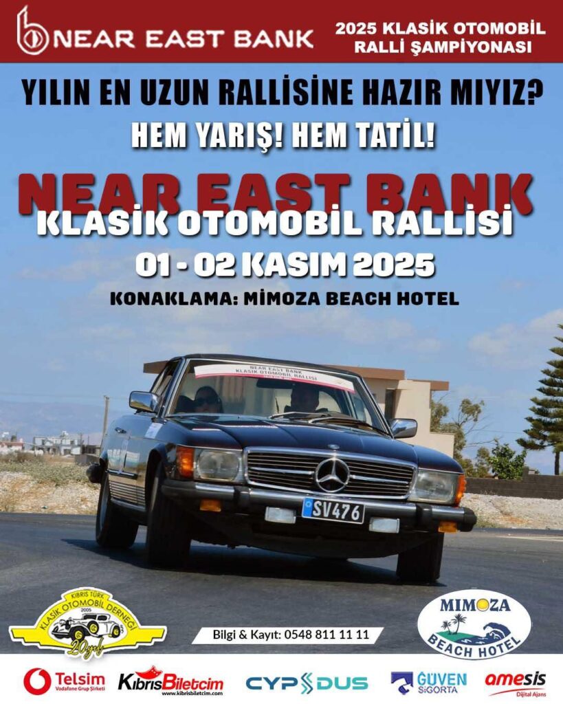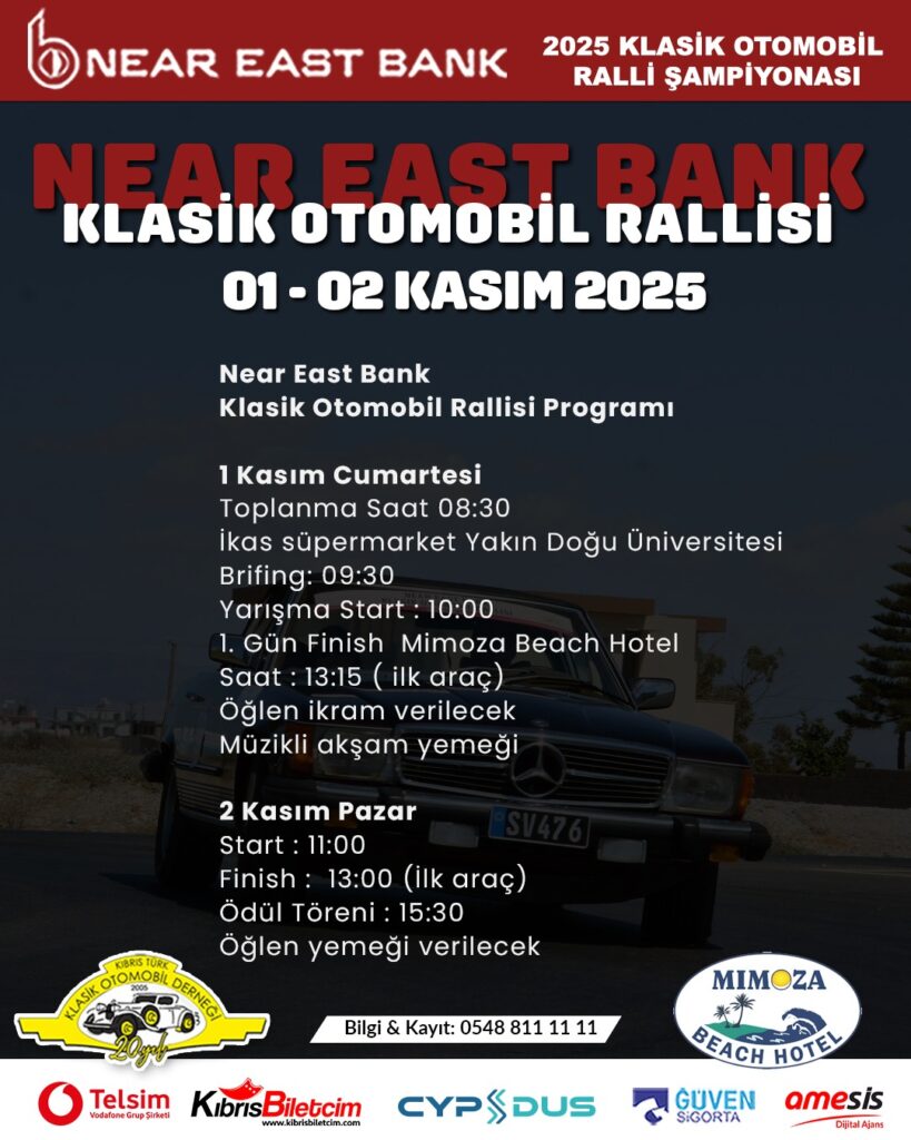Kıbrıs Türk Klasik Otomobil Derneği’nin (KTKOD) geleneksel olarak her yıl yaz sonu organize ettiği sezonun büyük rallisi bu yıl 1-2 Kasım 2025 tarihleri arasında yapılıyor. Sezonun en uzun rallisi olan ve konaklamalı olarak 2 günlük organize edilen rallisi bu yıl yine “Near East Bank Klasik Otomobil Rallisi” adıyla yapılacak. KTKOD Near East Bank 2025 Klasik Otomobil Ralli Şampiyonası’nın yedinci etkinliği ve üçüncü rallisi olacak olan ralli, 1 Kasım 2025 Cumartesi sabahı saat 10.00’da Yakın Doğu Üniversitesi Kampüsü içerisinde bulunan İkas Süpermarket önünden başlayacak.